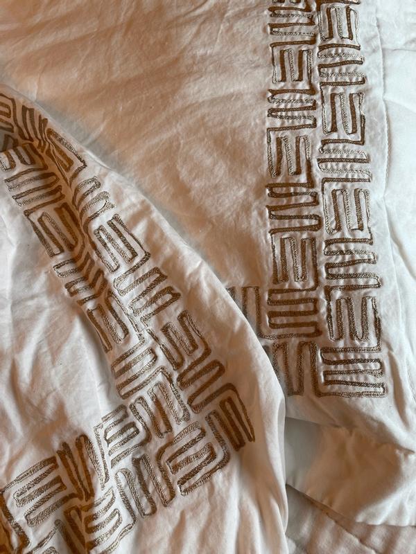 Beautiful duvet cover with pillow shams. I love the embroidery detail that reminds me a lot of a Greek key design, and the cotton is very soft and high quality. Overall a great set and love that it’s all 100% cotton. I’m sure it will last for many years.