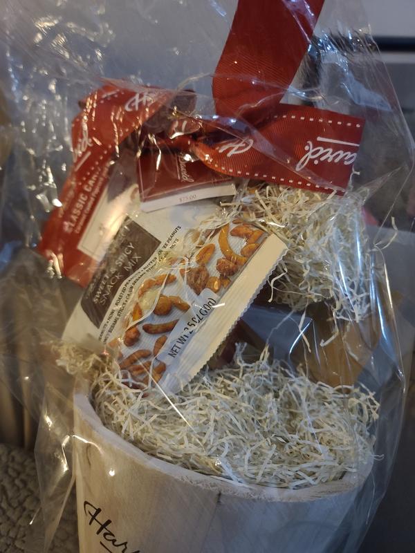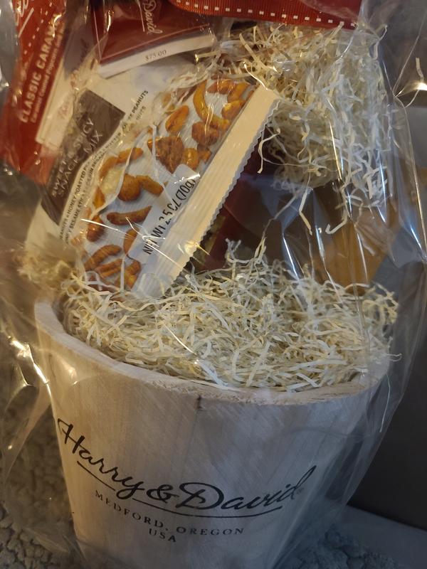 I received this as a Christmas gift. I have never been so disappointed in Harry and David. The chemical smell from the wood basket impermeated the food items and destroyed the taste. I had to tell the giver we loved but we were unable to eat any of it