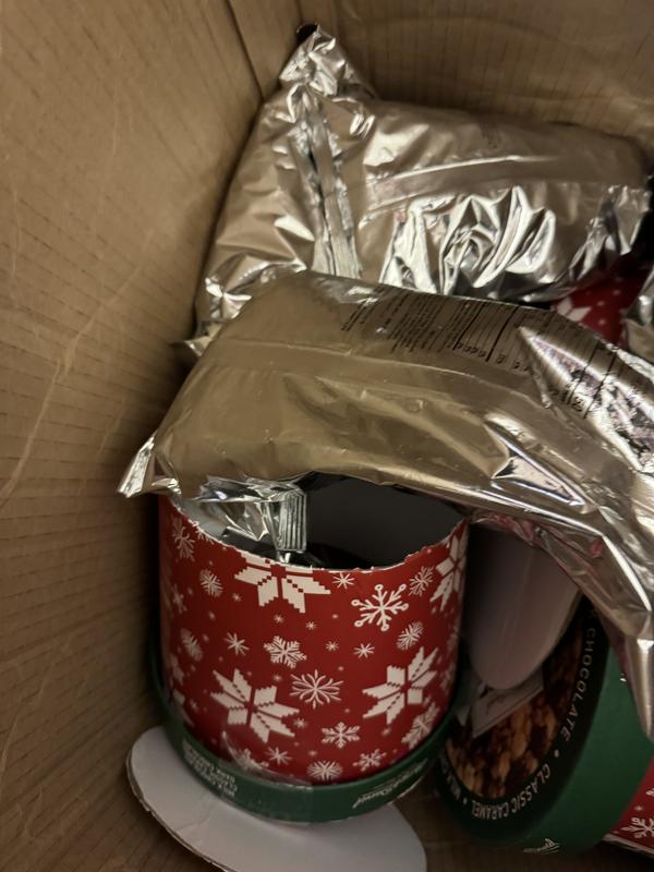 We purchase Moose Much every year for the holidays to enjoy and share. It is consistently good. This container had 3 foil bags sealed with the 3 different varieties of popcorn treats. And the container is a good size for storing small items later (I like repurposing useful packaging).
