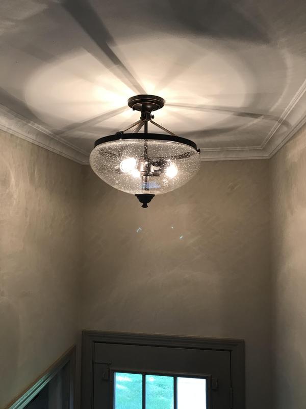 I have a small vestibule/mud area that drops down four steps from the main level going out the back door. I needed something to fill that higher ceiling void above the back door while adding a touch of elegance. This piece was perfect—brightens up the space and the seeded glass is beautiful. The entire fixture is ever so slightly crooked but hardly noticeable and the bowl does collect dust and will need cleaning twice a year or so to keep it clear. Other than that, I’m pleased. Installation was manageable with just one person but would be much easier with some help.