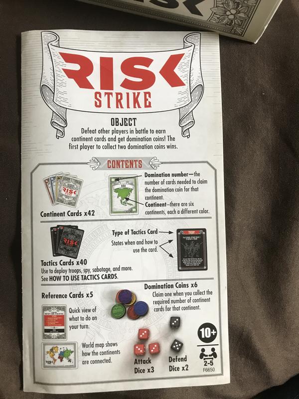 I got the Risk Strike Cards and Dice Game for a fun game night game. All my friends that came had a blast playing. We had a bunch of laughs and a great night. I have a few of there games and this is a nice add to the collection. I hoping to get even more, there games are one of the best