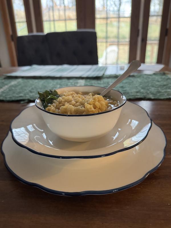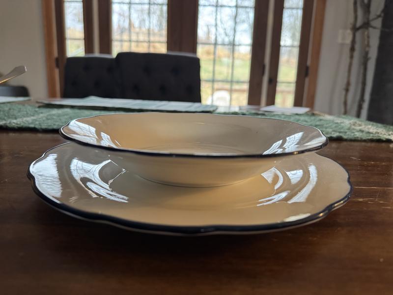 These are simple, yet the slight wavy edges with navy trim add such an interesting detail. Not too heavy, not too light; the bowls and plates are the perfect size. This set can switch from elegant dining to simple dinners effortlessly. This set exceeded expectations.
