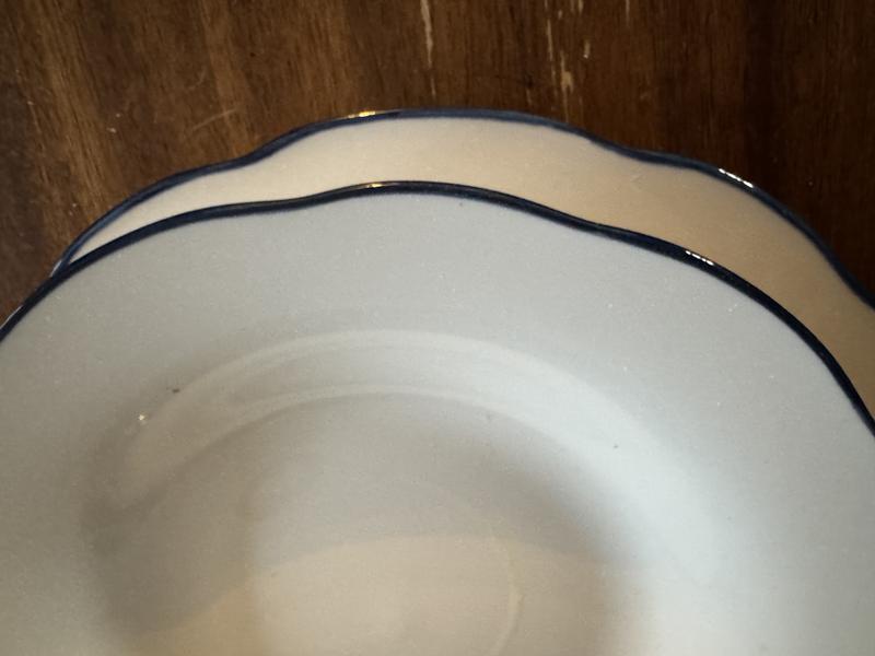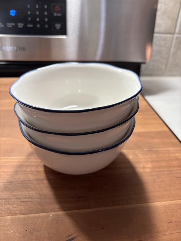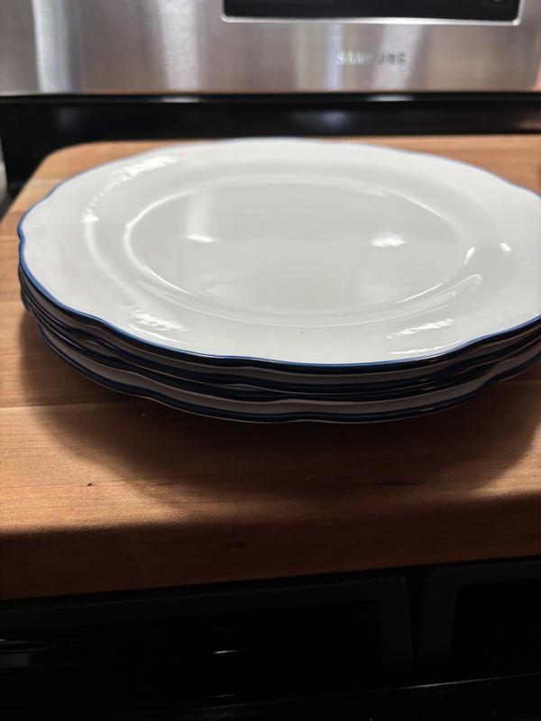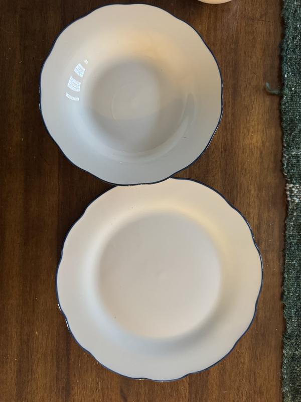 Super cute every day plates. They are a true white, not off white and have dark blue (not quite navy) edge. I LOVE the scalloped edge so much, it makes them so cute. The dinner plate is nice and large, the bowl is on the smaller side but not too small to use. The salad plate has a little bit of depth and could be used as a pasta plate. Overall love these, they’re classic, cute and well made.