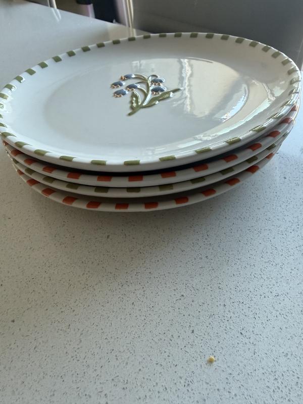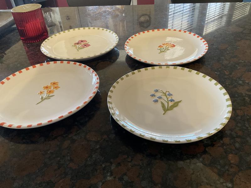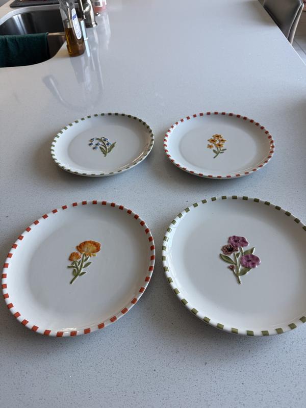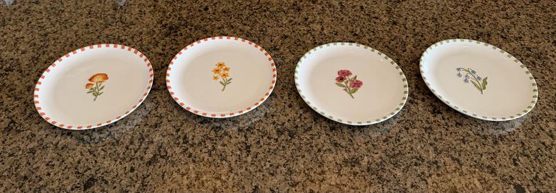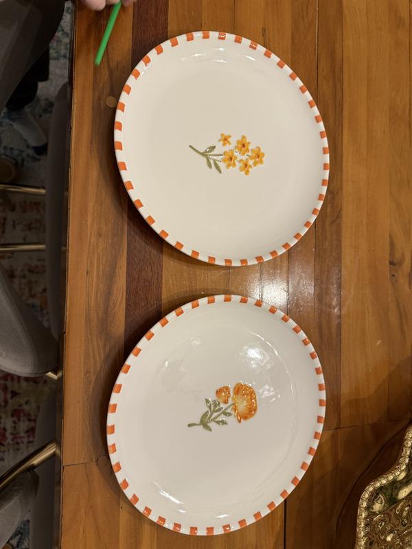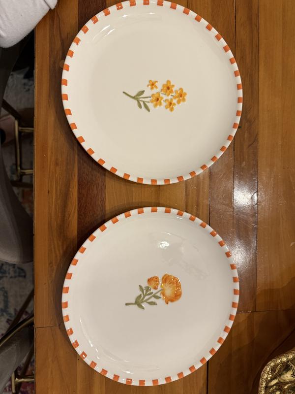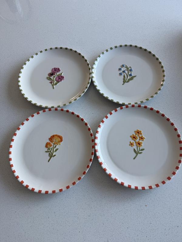 These are so cute! I love that each plate has a different flower design - the hand-painted look is really charming and adds a nice pop of color to my table. The checkered borders give them a fun vintage vibe. I've been using them for a few days now and they're holding up great. I hand wash them and the paint hasn't faded at all. They're the perfect size for salads or dessert.Highly recommend!