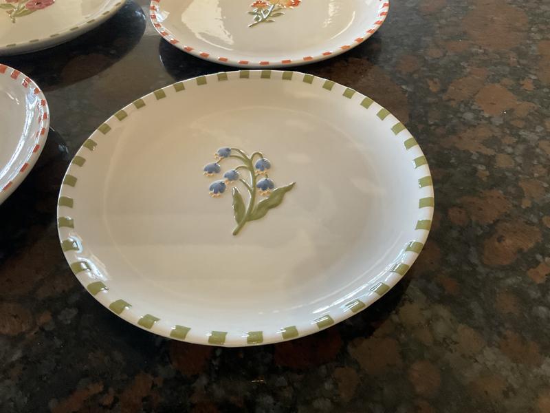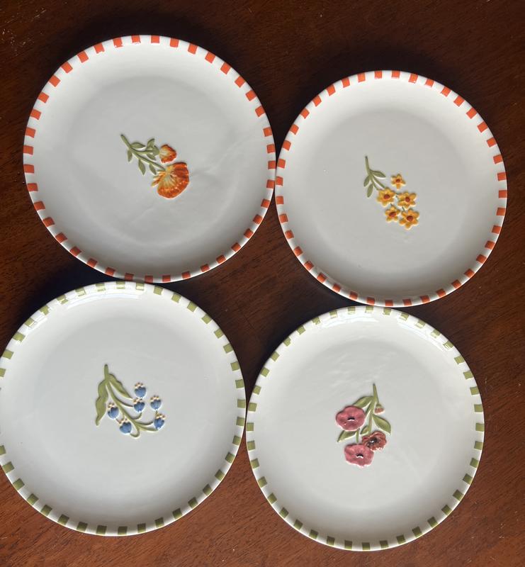 This is a set of four Haven salad plates. The plates each have different flowers on them.what is really nice is that the flowers are not flat painted but instead are raised a quarter of an inch. These plates remind me of the Portmeirian Pottery of Wales.These plates are especially perfect for Easter, spring,and summer, but can be actually used any time.Theybare large enough to use if you are just serving salad as a main course. You won’t reg getting these plates.