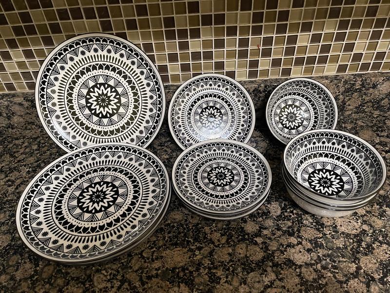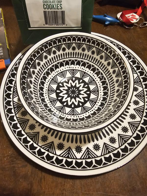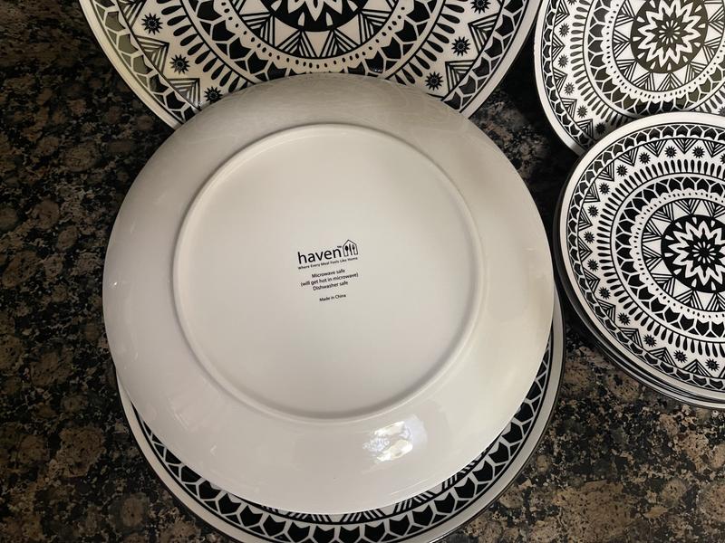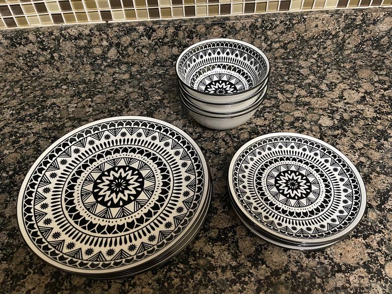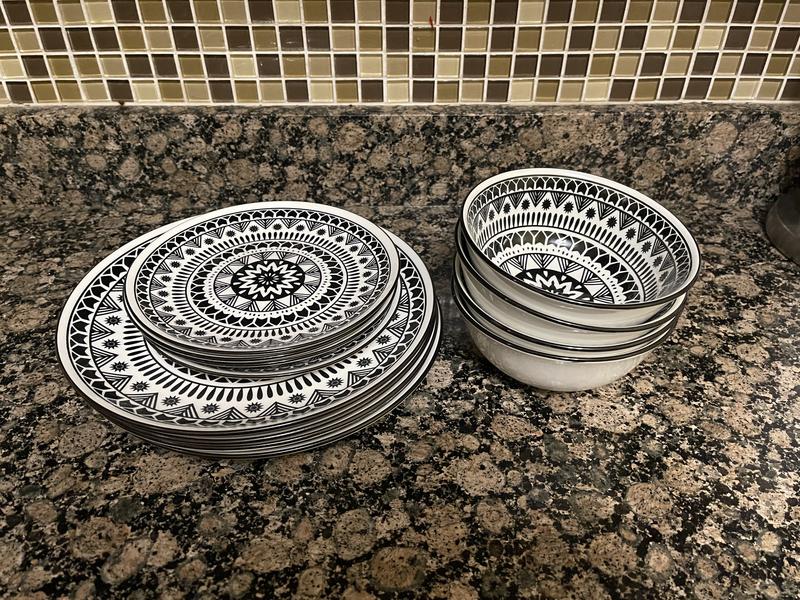 This dinnerware set is absolutely stunning , love the bold black and white print . Its a high quality and durable product , dishwasher and microwave safe too No issues with delivery and packaging , all pieces in the set came intact . Highly recommended.