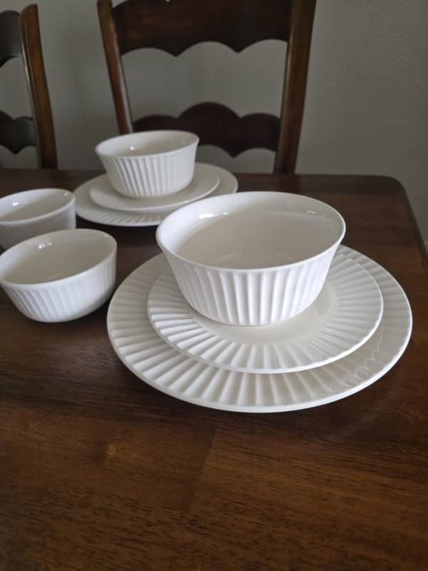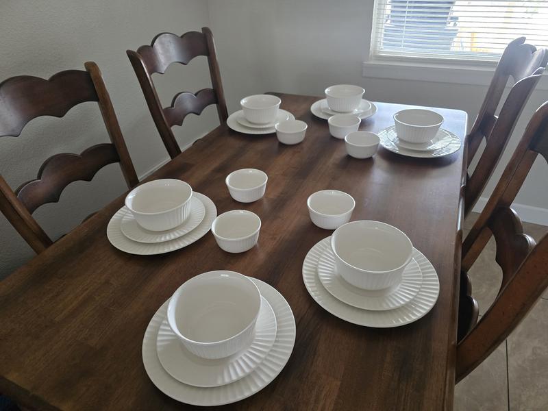 Great dinnerware set for both formal and every day use. Love the clean white looks and kind of elegant design! Plus microwave and dishwasher safe! Great value too!