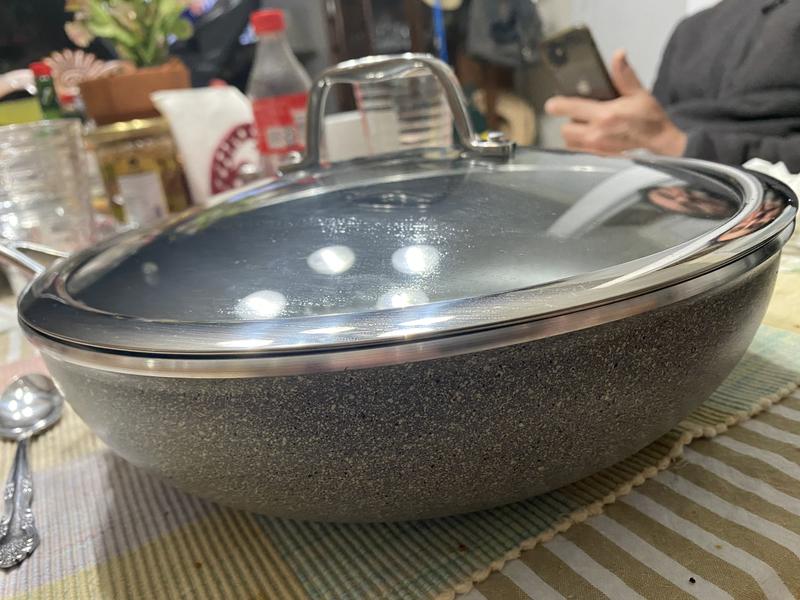 Wonderful product! Very large wok shaped pan with great glass lid. I added this pan to my 3 fry pans from the same company. Perfect addition!