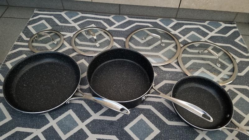 My husband & I love cookware. It cooks evenly and is a dream to clean. We also love the way it looks. The reason I gave the set 4 stars rather than 5 stars is primarily because I would prefer slightly bigger saucepans with lids to fit the skillets. Overall, though, we are happy with the set and hope to use it for many years.
