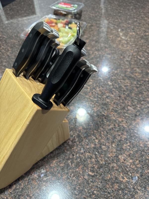Great looking knife set. I tested each one and each is RAZOR SHARP. Great quality. Only complaint is the scissors don’t come apart like some other Henckels scissors but not an issue.
