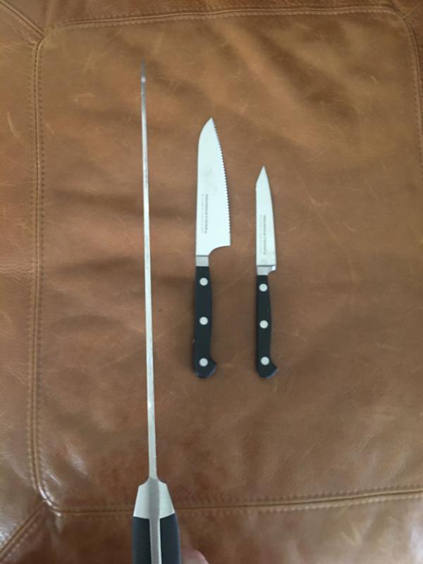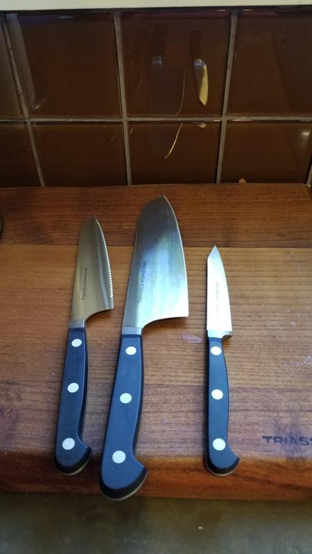 Love the sizes of these knives - they have a good grip and balanced weight. The chefs knife is my go to for kitchen prep and the smaller serrated knife is a great addition to my knife block. The paring knife has a little extra length compared to my other one.