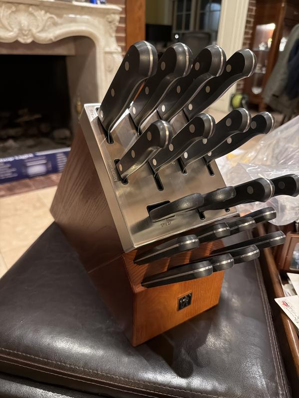 I’ve been wanting new knives for about 12 years and after all my research, Henkels was the brand everyone suggested. Glad I went with it because I love my new set! The knives are SHARP, I haven’t been able to slice something so easily in years. The block is way longer than my previous one (probably because it’s a self sharpening block?) but it look gorgeous in my kitchen! Will be recommending this set to everyone!