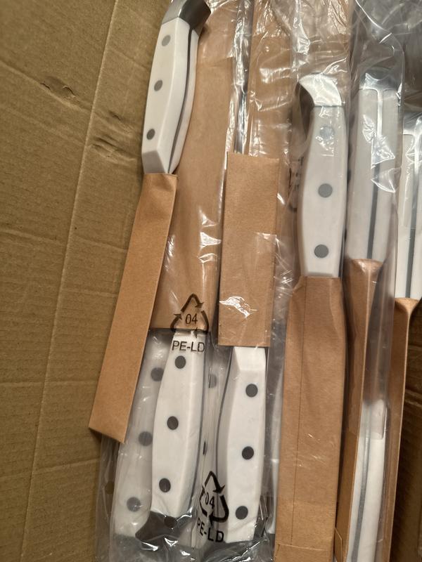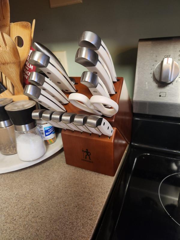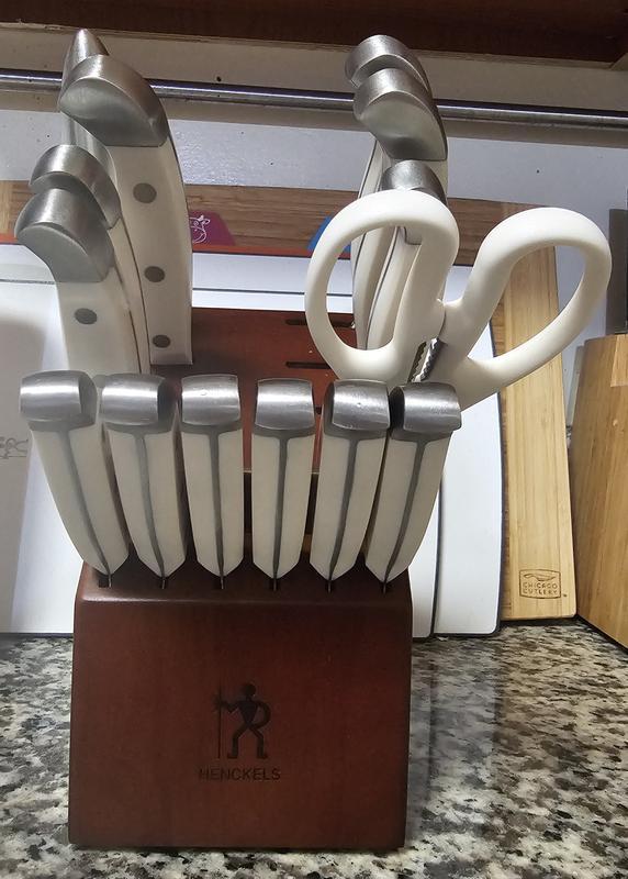 This knife set was a gift and I LOVE it. I don't think you realize how dull your knives are until you get a sharp one! The white handles are gorgeous and look great in my kitchen