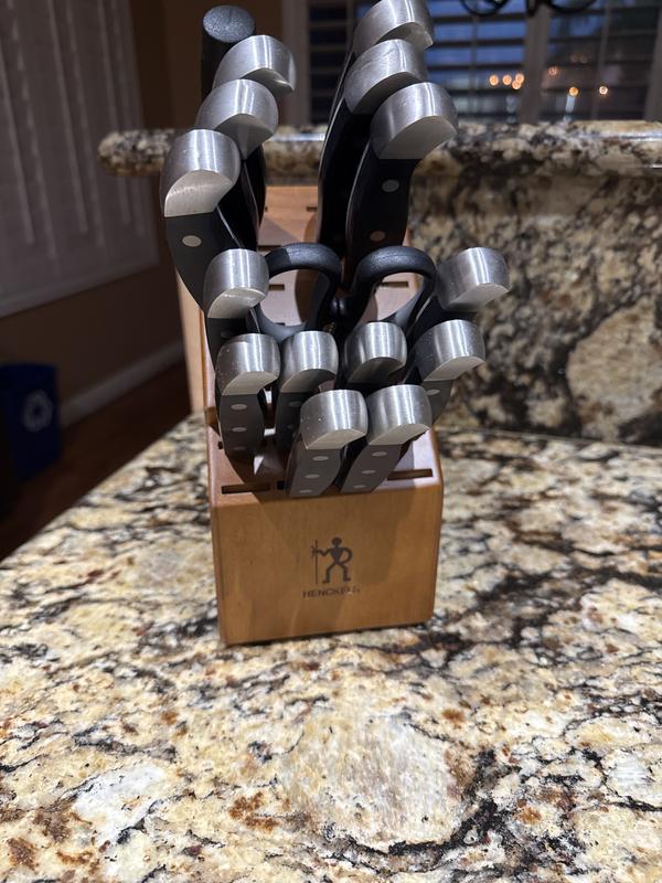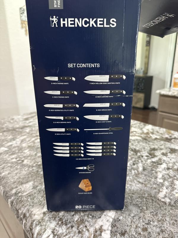 this Henckels 20‑piece set is pretty sweet. The chef’s knife cuts stuff super easy and the Santoku doesn’t let food stick, which is nice. the bread knife slides right through a loaf without squishing it. Handles feel comfy and the knives stay sharp enough for daily cooking. All in all, a solid, cheap kit that does the job.