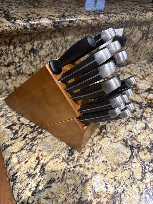 I received the 20 piece block set as a Christmas gift December 2024 and I highly recommend buying these. I cook for a living so I’ve used a fair share of knives. They hold an edge well and after almost a year of daily use, I know they will slice through anything I prep. Wash them by hand as the manual clearly states, however my gf ran them through the dishwasher not knowing and didn’t have any issues.