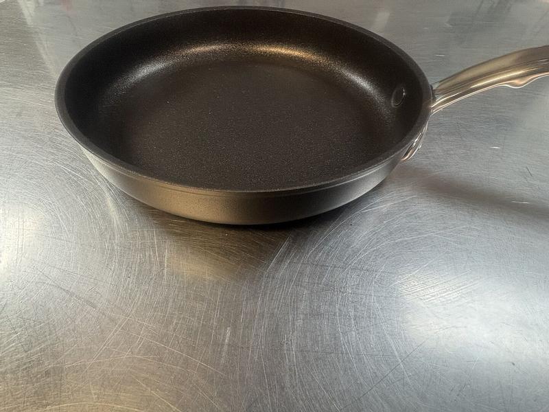 I cook breakfast in a small boutique hotel. I’ve been using cheap nonstick pans for years now. I’ve only had nice nonstick pans during my tenure at the Ritz Carlton (Mafter Bourgeat). I still use one of those pans today, so a well made non stick pan can last a lifetime if it’s well maintained. That pan is 30 years old. The Hestan pans are built like a tank. I particularly like the seamless rivets; clean up is easy with a sponge and blue soap. The smaller (egg) pan is bigger than I’m used to. The open design has much more usable surface area. The eggs cook faster at a lower temperature. At CIA we were taught about the four parts of an egg white, and with an even temperature you can see the egg whites set at different times. I flip them just before the inner whites set; over fifteen seconds for easy and over thirty seconds for medium. I wish the sides were sloped and the pan was smaller, but I’ve adapted already. The coating is very slippery, so it only takes a flick to get them over. The 9 1/2 inch pan makes gorgeous omelettes. Again, sloped sides would make rolling the omelettes onto the plate easier, but I have figured that out too. I use a high heat silicone spatula and neutral sauté oil. Nothing fancy. I seriously doubt I’ll need another set of pans, although I’ll probably get another egg pan or two so I can do multiple orders of fried eggs at a time.