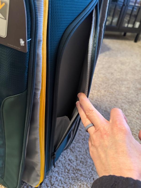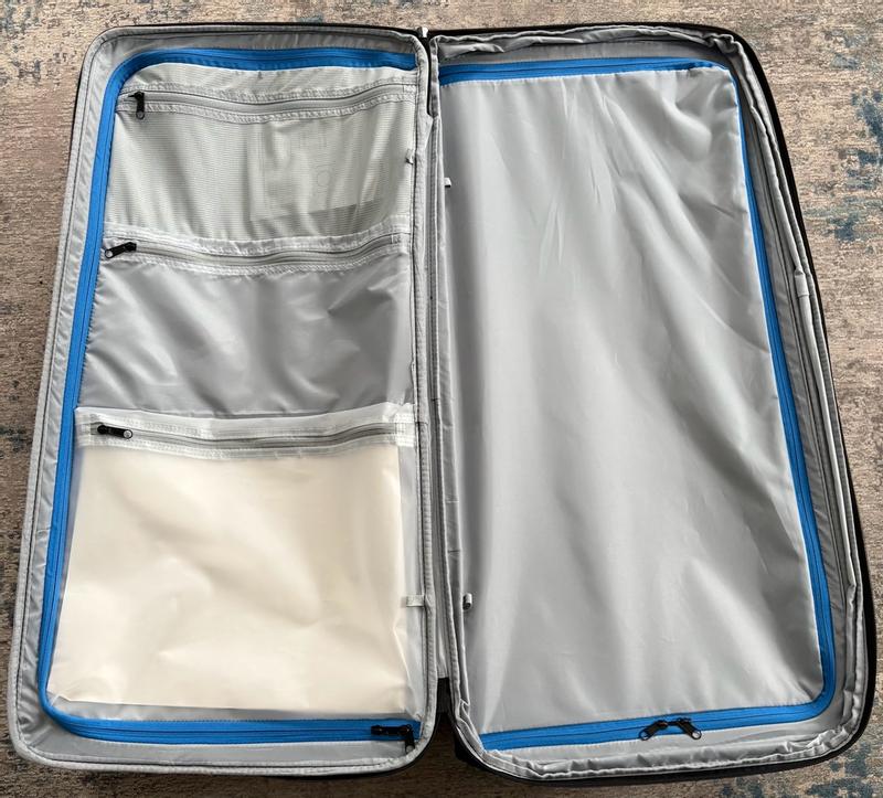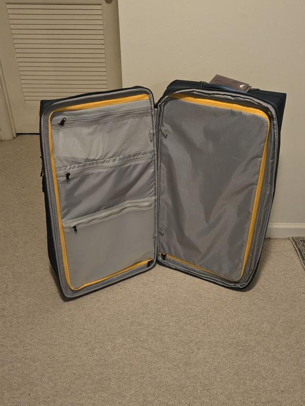 This suitcase is tall and slimmer than other large suitcases I have had in the past. It has lots of different compartments making it easier to organize when going on a trip. For me (5ft) it was a little odd to roll since its so tall but nice that it is so slim. I wish it had 4 wheels for the 360 roll but other than that I think this is a really well made suitcase. The colors were not my favorite but would stand out in the airport to easily locate your luggage.