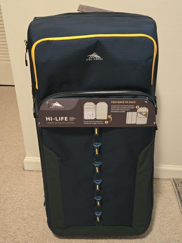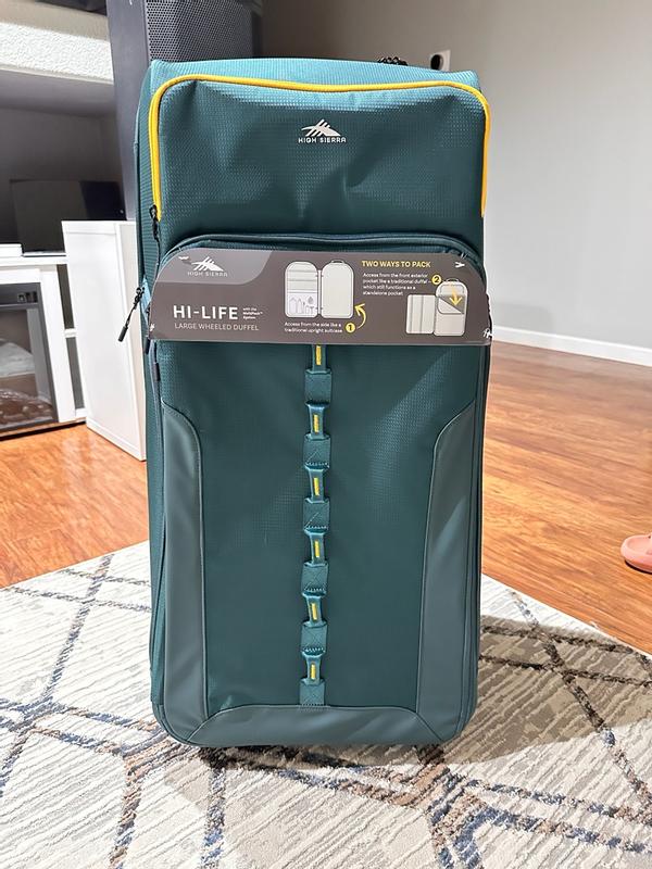 The High Sierra Hi-Life Large Wheeled Duffel is a great option for travelers seeking ample space and smart organization. With multiple compartments and double-sided deep halves, it offers excellent storage flexibility, allowing you to separate and access your belongings with ease. One standout feature is the front half exterior, which gives you an alternative entry point to the main suitcase—a thoughtful touch for quick access. However, there’s a notable downside: the two stationary wheels. In a market where four rotational wheels have become the standard for smooth, effortless maneuverability, this model’s design feels a bit outdated. It may not be the best choice for those who prioritize easy handling, especially when navigating crowded airports or uneven surfaces. That said, the quality of the materials used is impressive, and if you're not overly concerned about wheel mobility, this duffel still stands out for its sturdy construction and spacious design.