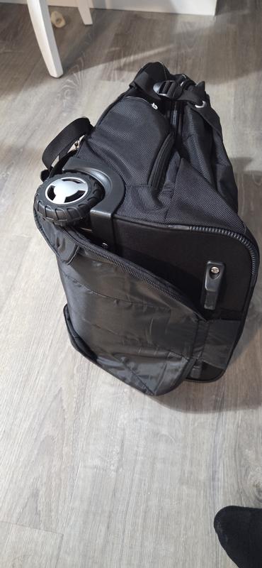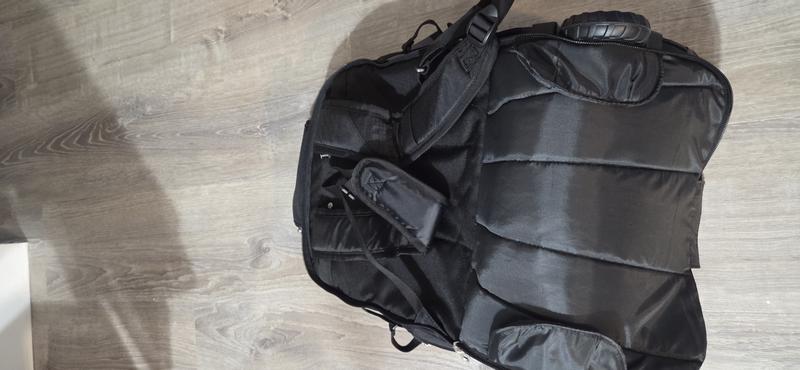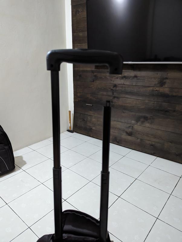 Recieved with screws from handle bent and not in slot Back pack strapa in pouch that when use have to gold over and velcro to bottom of bag which then you cant roll because it would be would damage fabric from rubbing on ground. Contacted to return and only recieved email to review product