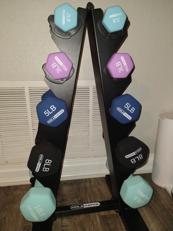I received my free sample of the HolaHatha - HolaHatha 2, 3, 5, 8, & 10 Lb Neoprene Dumbbell Free Weight Set w/ Rack, a couple days ago and their great. They arrived in mint condition the rack was not hard to put together, and it's not to big. I can put it in a corner out of the way. They are a perfect set for everyone to use.
