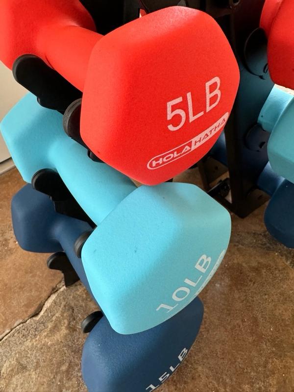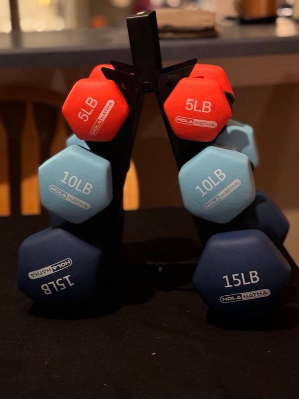 I received this product for free from Influenster in exchange for my honest review. My daughter loves to work out with these. We use them several times per week during our workouts. I just wish the carrier handle was a little softer or cushioned because it's almost useless just by how it hurts the hand. With it being weights, it kind of digs into your hand. If that makes sense. They should rethink that. The stand to store them on is perfect size and saves space. Overall, the weights do their job, so it's fine. Love the colors!