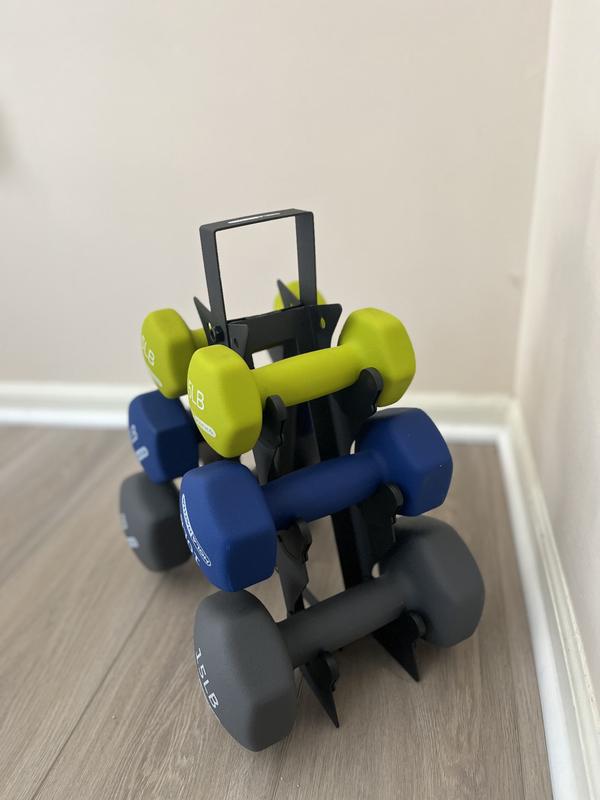 I received this product for free from Influenster in exchange for my honest review. My daughter loves to work out with these. We use them several times per week during our workouts. I just wish the carrier handle was a little softer or cushioned because it's almost useless just by how it hurts the hand. With it being weights, it kind of digs into your hand. If that makes sense. They should rethink that. The stand to store them on is perfect size and saves space. Overall, the weights do their job, so it's fine. Love the colors!