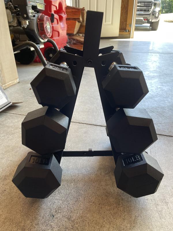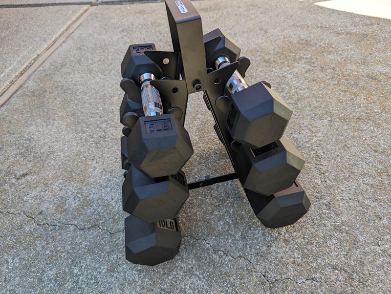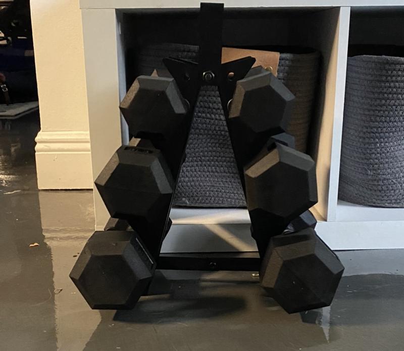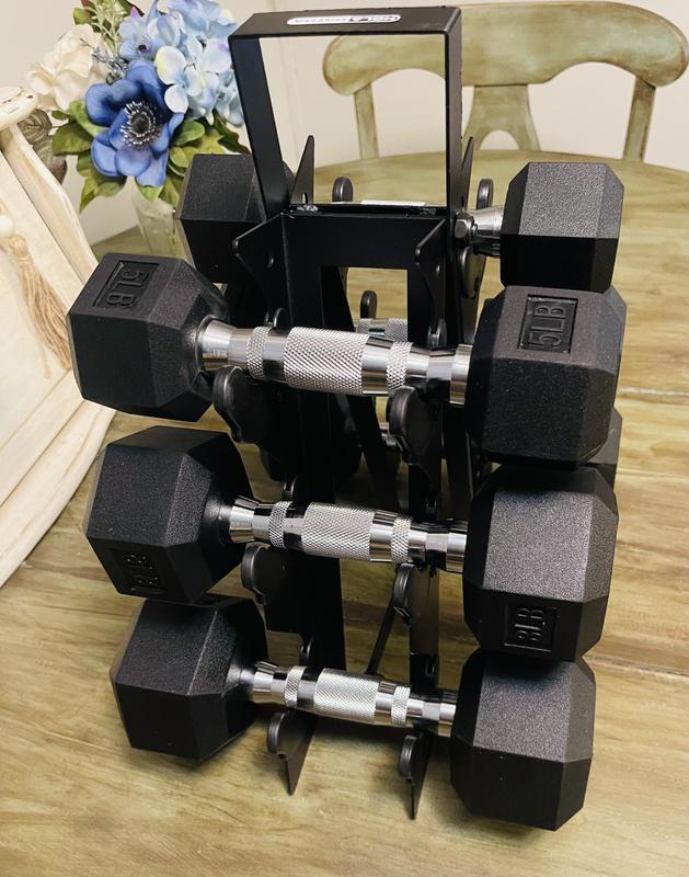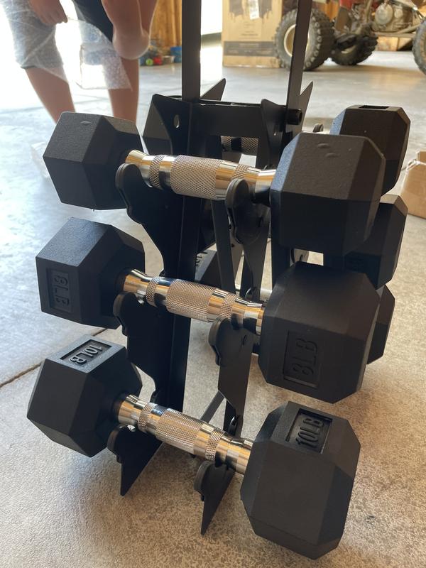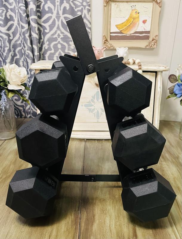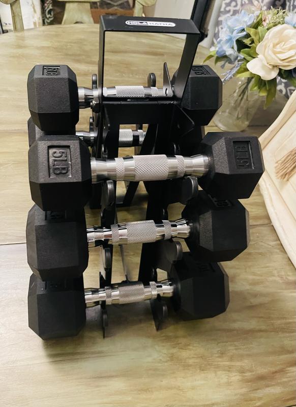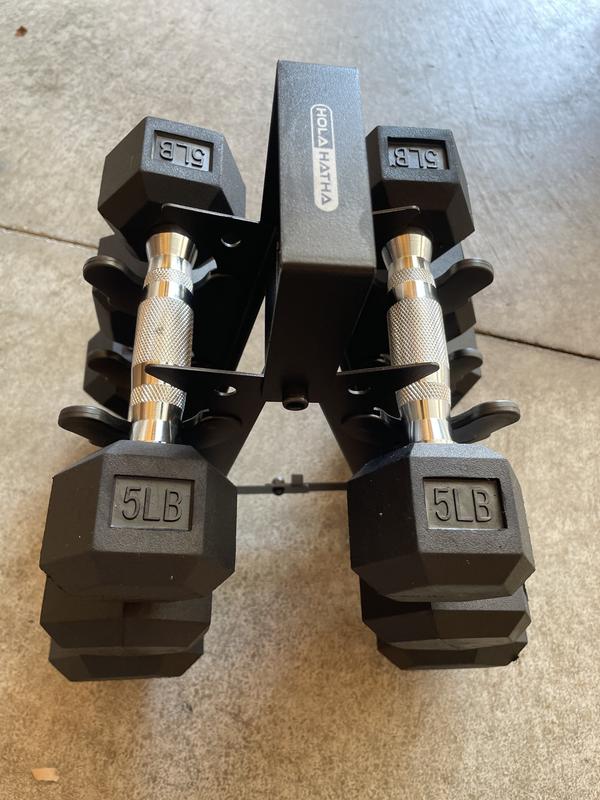 We received our HolaHatha Hexagonal Dumbbell Free Hand Weight Set With Rack These are amazing, great quality, the rack also has a handle, and with a slim design It did have a rubber ish smell when we unpacked it, but went away a in a couple of days With 5lb, 8lb, and 10lb weights it's good for the whole family, and beginner to experience We recommend this product
