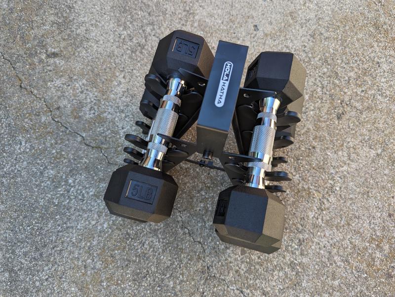 The HolaHatha Hexagonal Dumbbell Free Handweight set has been such a nice addition to my home workouts. It comes with 5lb, 8lb, and 10lbs dumbbells and a super sleek rack to store. I love the matte black look so that storing in the open doesn't look bad at all in my home.