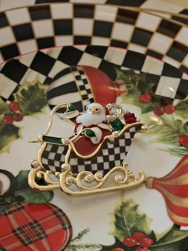 This Santa in his sleigh pin is beautiful. It is not going to go unnoticed on a coat, sweater, or jackets. It is a great addition to your holiday jewelry collection.