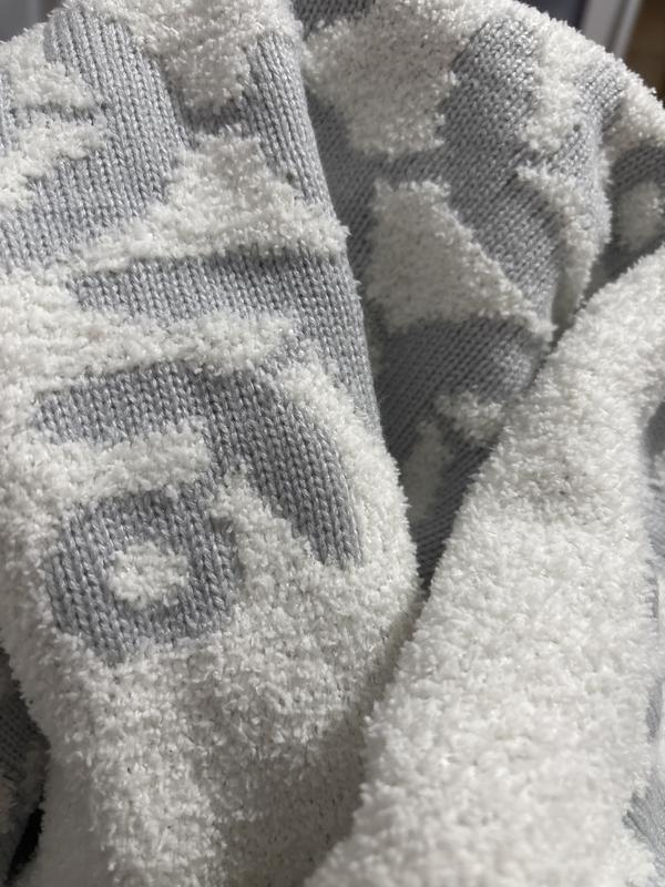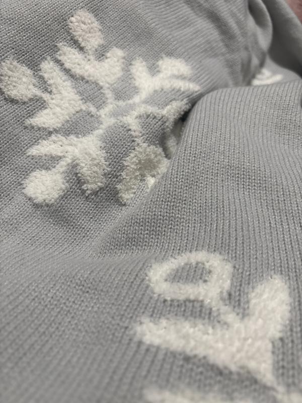 This blanket is so soft. I purchased it in gray and in green on one side it is gray knit with fuzzy white snowflakes on the other side. It is fuzzy white with grey knit snowflakes. It is so cute! I haven’t opened the green one. I will wait until next year.