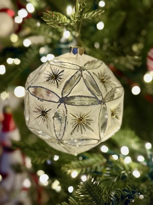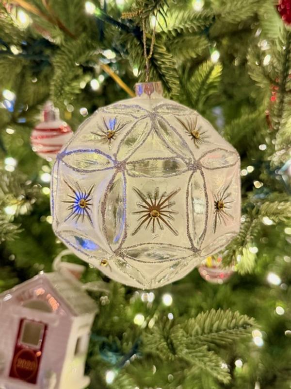 These are absolutely beautiful especially with Christmas tree lights illuminating behind them. They appear more opaque white with clear areas outlining the sections. The online photos do not do them justice. Very happy with these beautiful ornaments.