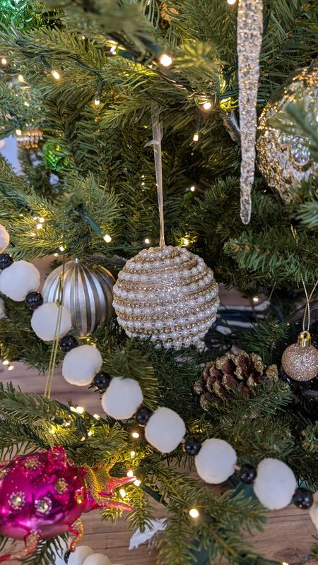 This ornament is wonderful. The pearls and gold really stand out. I have a Christmas tree like this so it is an added piece to match. And the size is great. I would recommend it.