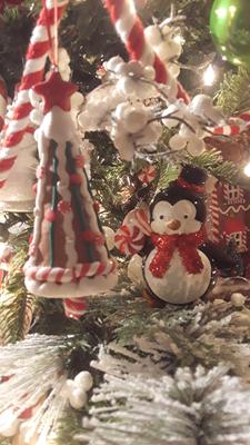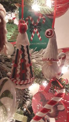 It is very intricate and colorful. I love gingerbread men and I love the glitter. You can see the glitter shine as you walk by the ornament. The gingerbread can be used as an ornament or be displayed on a small table. I like the red ribbon. Very cute!