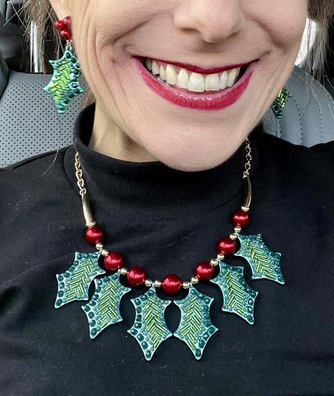 I don't usually buy holiday apparel, but I had a gift certificate, and this necklace made such a statement that I had to buy it. I was able to wear it with both red and black tops during the holiday season. It really dressed up a plain turtleneck and dress for holiday parties.