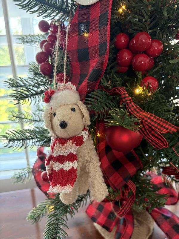 The Holiday Lane fluffy dog ornament is so charming. My dog Sadie looks very similar. If you love dogs and cats, this collection is great. The ornament adds so much sweetness to the Christmas tree. The little details of the hat, striped muffler and holly are lovely.