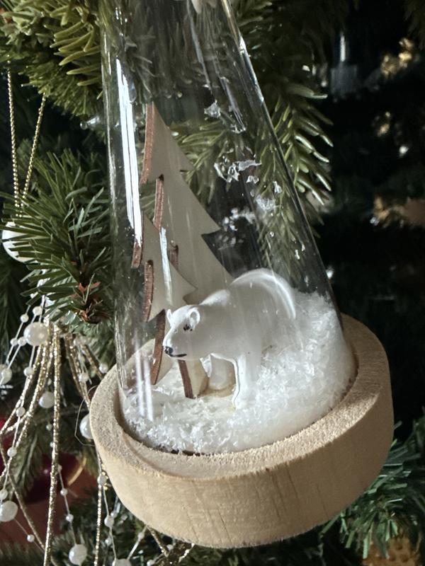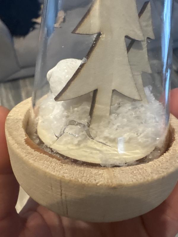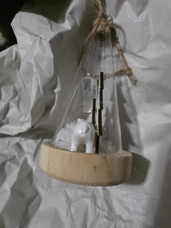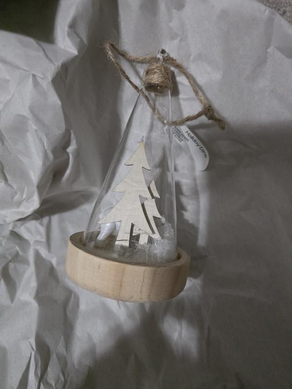 Ornament reminds me of a slow snow globe -minus the liquid. It has a heavy wood base with free flowing snow inside when shaken The globe exterior is glass. Mine arrived broken, even though it was packaged very well. Anxious to see how the replacement arrives. Overall, it is a nice heavier ornament, and great for the sale price.