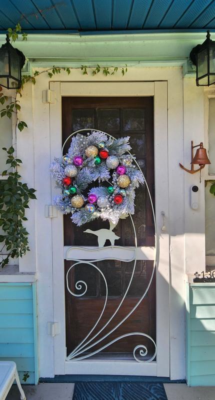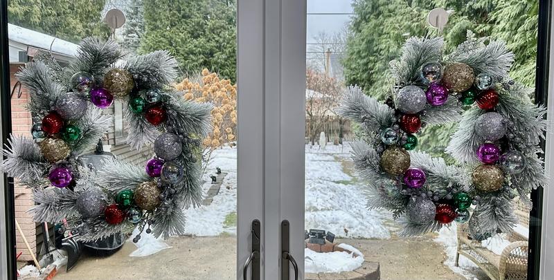 Attractive large circular wreath. White spray snow generously covers the long pine needles. Christmas bulbs of variousl colors are evenly placed among the pine needles. The wreath is backed by a thick circle of twig like needles, giving it structure. This is one of the nicest wreaths and appears to be made of real pine. The only problem I have had,is that because it was sitting in a warehouse for a lengthy time, it smelled of mold. This was easily remedied by a lemon juice spray. Thank you.