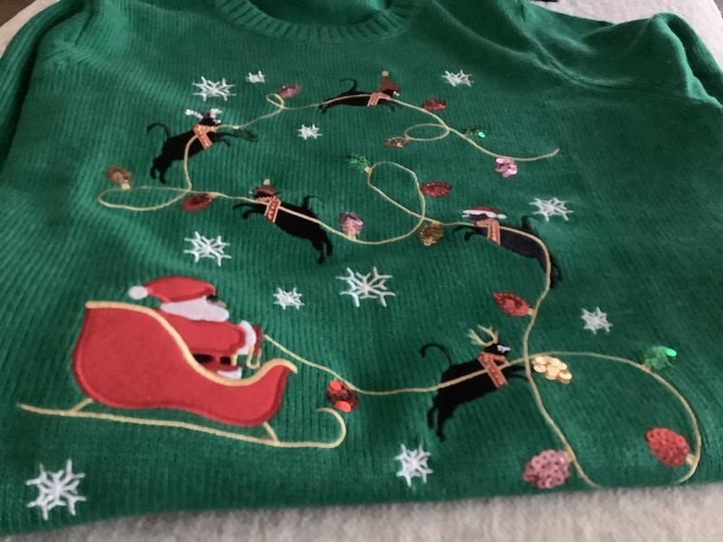 When I saw black cats wearing different Christmas hats, pulling Santa’s sleigh I knew this was the sweater for me. It runs true to size in a beautiful green color, the sleeves actually reach your wrist. There are white stitched snow flakes and sequins in different colors for the lights. Santa and his sleigh are red felt. Just waiting for December to wear it.