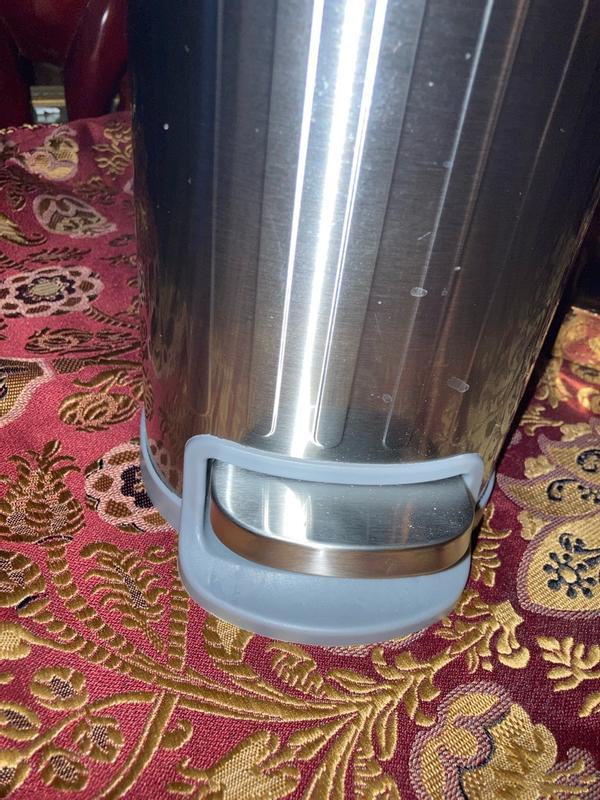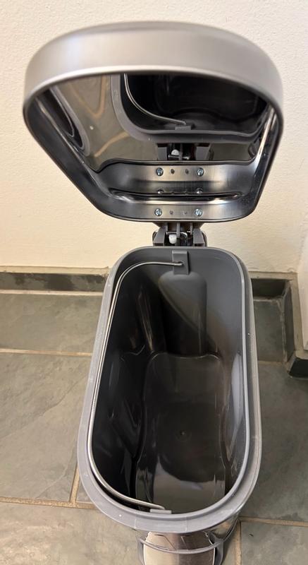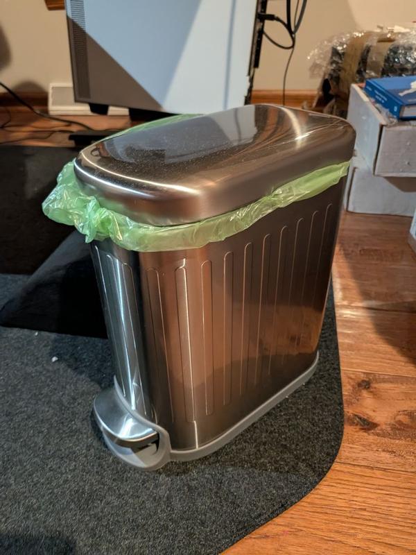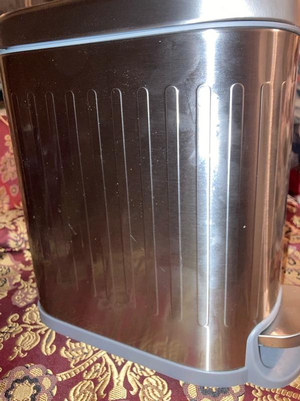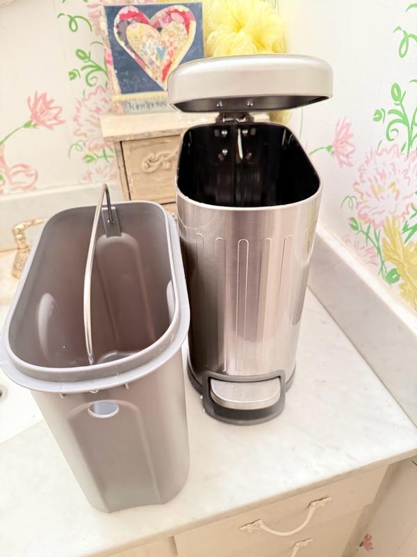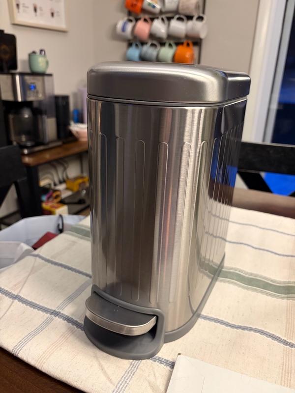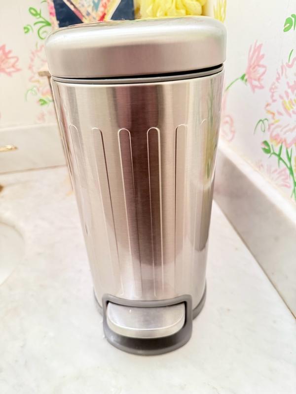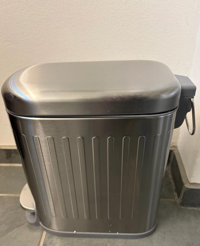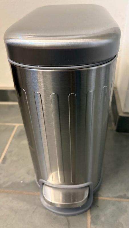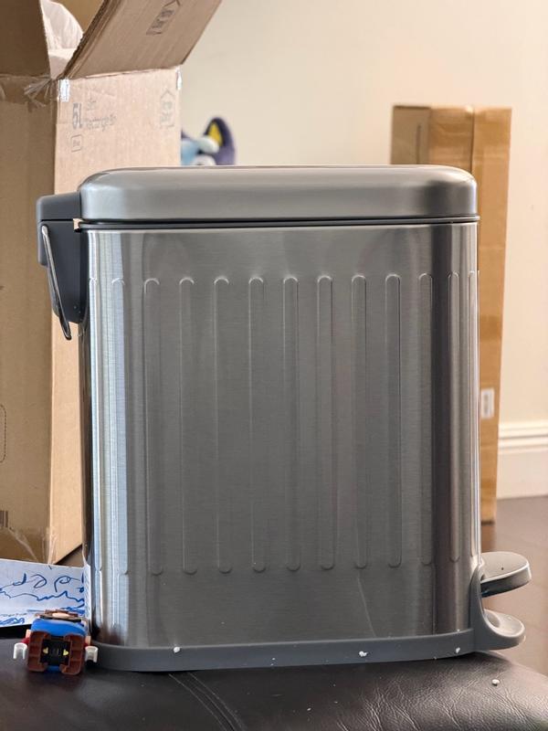 I love this stylish trashcan! It looks high-end with a brushed, stainless steel finish that doesn't show scratches. It has a convenient foot pedal to open. I love that it has a soft-close hinge so the lid doesn't slam down when closing. It is so convenient to empty using the handle to lift the container, which is also washable. The rectangle shape is modern, and will fit in tighter spaces.