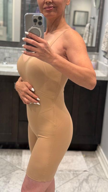 I wish Honeylove showed more full figure curvy models trying this on. Its a struggle to get this on with real curves. The “pee” hole is disastrous! For my body, it’s uncomfortable. The ribbing pokes into my skin because of my torso length. It doesn’t pull in the curves as expected. I will say that it is made very well and I like the material, but otherwise, no thank-you.