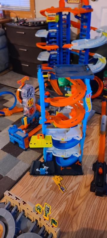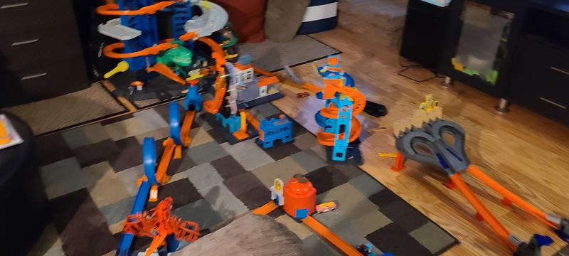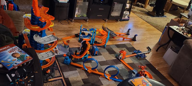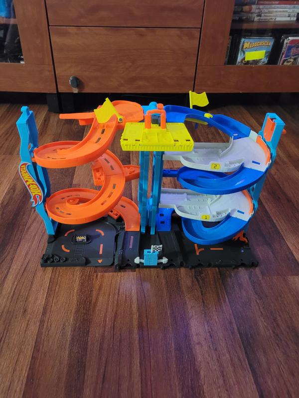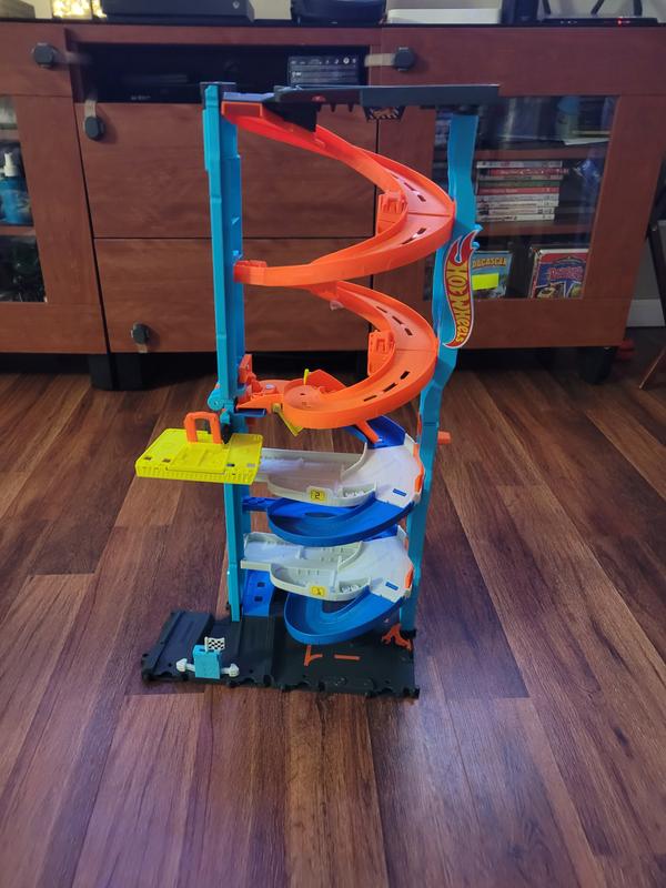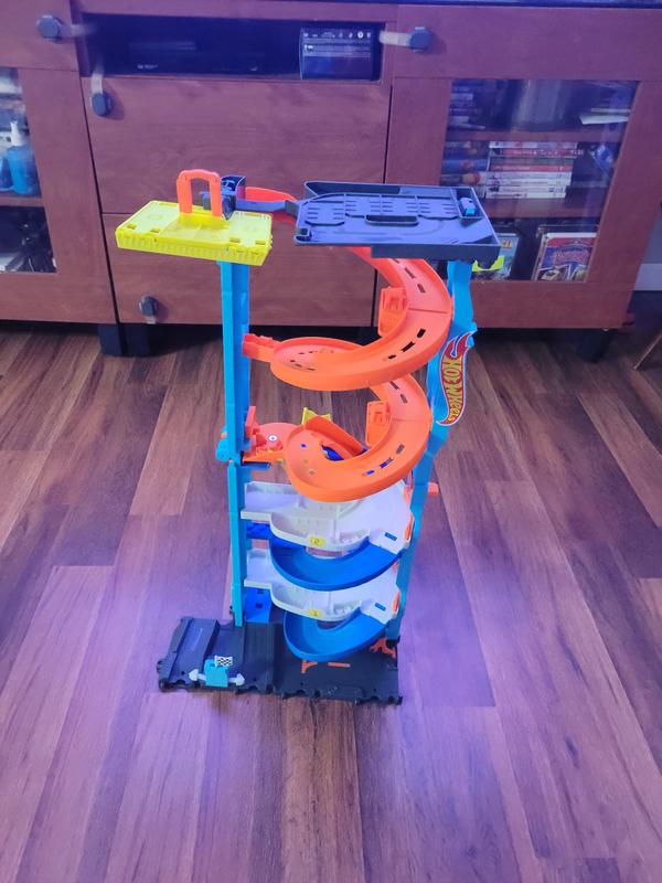 Disappointed Not a fair race when track is in half. Orange track is fast but most cars get stuck on the last turn of the blue track. Also means when the tower is at its highest again the cars don’t fully drive out the bottom