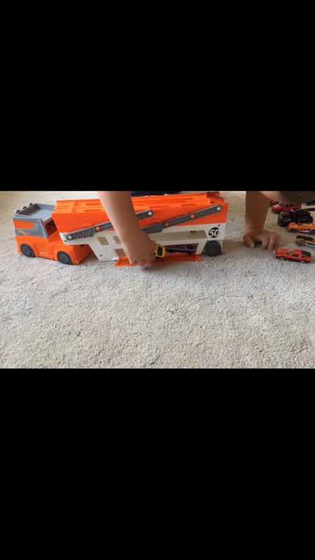 My son had so much fun with this Hot wheels mega hauler. He loved that he was able to keep ALL his cars in here and zoom it around the house while hauling all his other cars inside. It's really easy to use for them to put their cars in and even good on destruction when he was pushing it around and into the walls. This mega wheels hauler was made perfect for smaller kids who love cars .