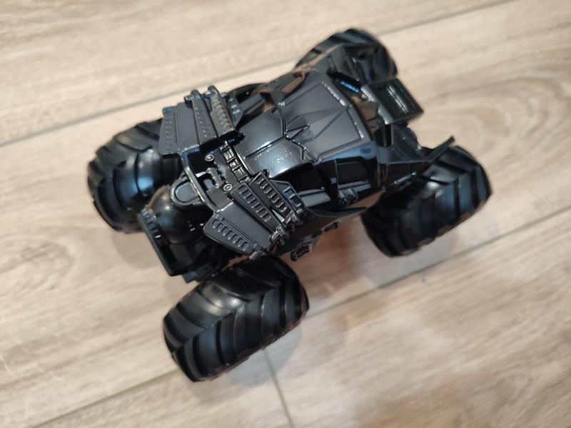 Hot Wheels Monster Trucks, Oversized Monster Truck is pretty cool! Its pretty big and fun to play with! We received the Batman monster truck. It has a metal body with plastic frame. Both front and rear wheels move in a sliding pilot slot to make the wheels more like monster truck tires, making sharp turns and big leans. We were using it to run over other Hotwheels.