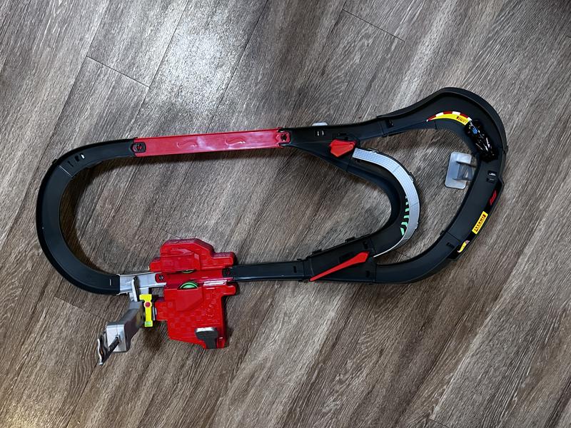 This is a really fun race track. I love that we don’t have to put batteries in it. It was very easy to assemble and disassemble. My kids love watching the cars race around. The negatives are that it is very loud, and there is a learning curve with the hand operated speed boost.