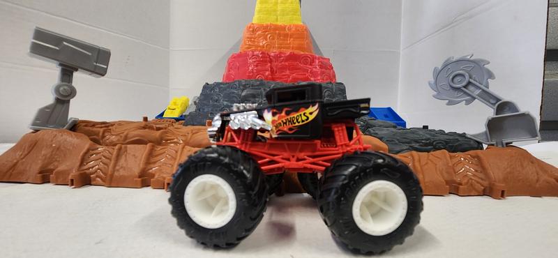 My son was very excited about this toy but it was not as fun aa we thought. I take my son to monster trucks and its so loud and obnoxious i think we was expecting the same thing with the toy. However it makes no sounds. The volcano doesnt always pop up and wasnt as "monsterous" as my son hoped. Lost interest fast.