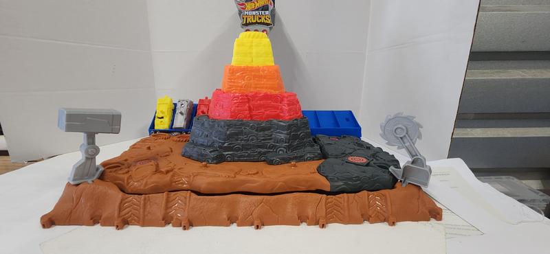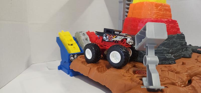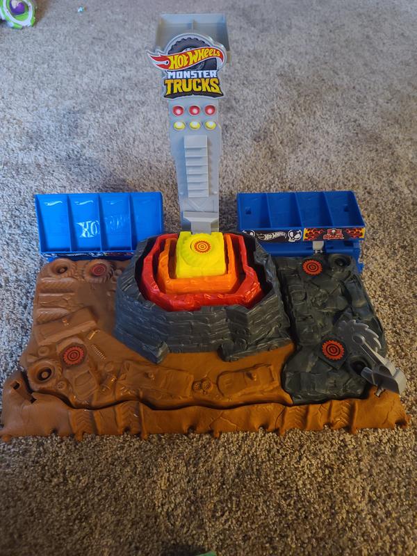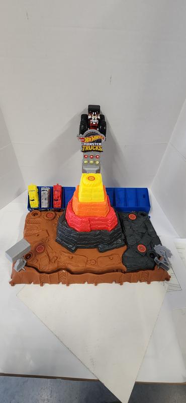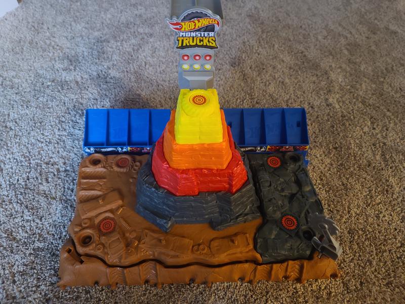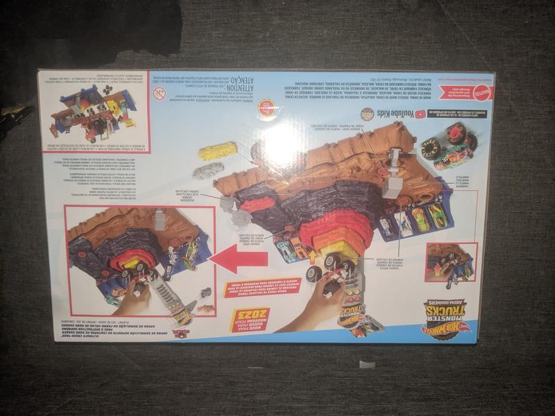 Both my seven year son and my ten year old son were not impressed with the Mattel monster truck arena. The tall grey piece is where you place your cars, and you place the monster truck on the volcano, push a bottom to expand the volcano and the volcano expands and essentially knocks the cars down. The toy took about 15 minutes to assemble, to which both of my sons felt was not worth their time and told me that this toy is “boring”. They did like the monster truck that came with the set.