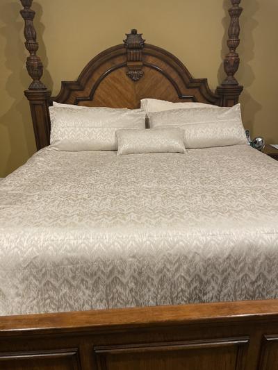 Loving the champagne tones of this bedding. The chevron on the set was subtle which I don’t mind. Decorative pillow has sequins on it on one side (didn’t expect that but those who love sequins will enjoy it — might give that to my mother). Comforter is soft and comfy. This set makes a great addition to any home.