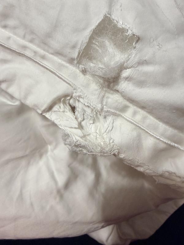 I received this product yesterday and washed it for the first time in my Spin Queen washing machine. Now, I have two big holes and stains in this expensive comforter and I'm very disappointed. I followed the washing instructions. Come on, Macy’s!