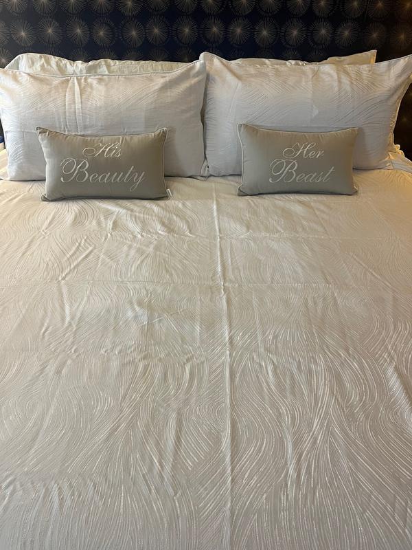 This set is absolutely beautiful especially when the light would hit it at certain angles to show some shine in the pretty pattern. It’s a beautiful white with a tiny hint of grey tones which made it too cool of a white for what I needed. So I returned it. But there’s nothing wrong with this set! It’s beautifully made and high quality.