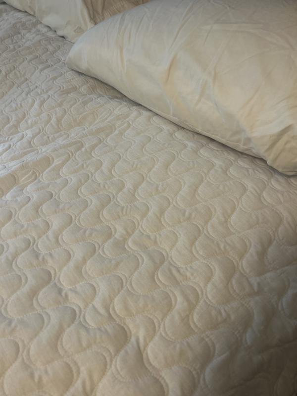 Lovely coverlet, light enough to use in south florida and prettiest color, just a whisper of a blue tint. Nice soft fabric, looks and feels great.